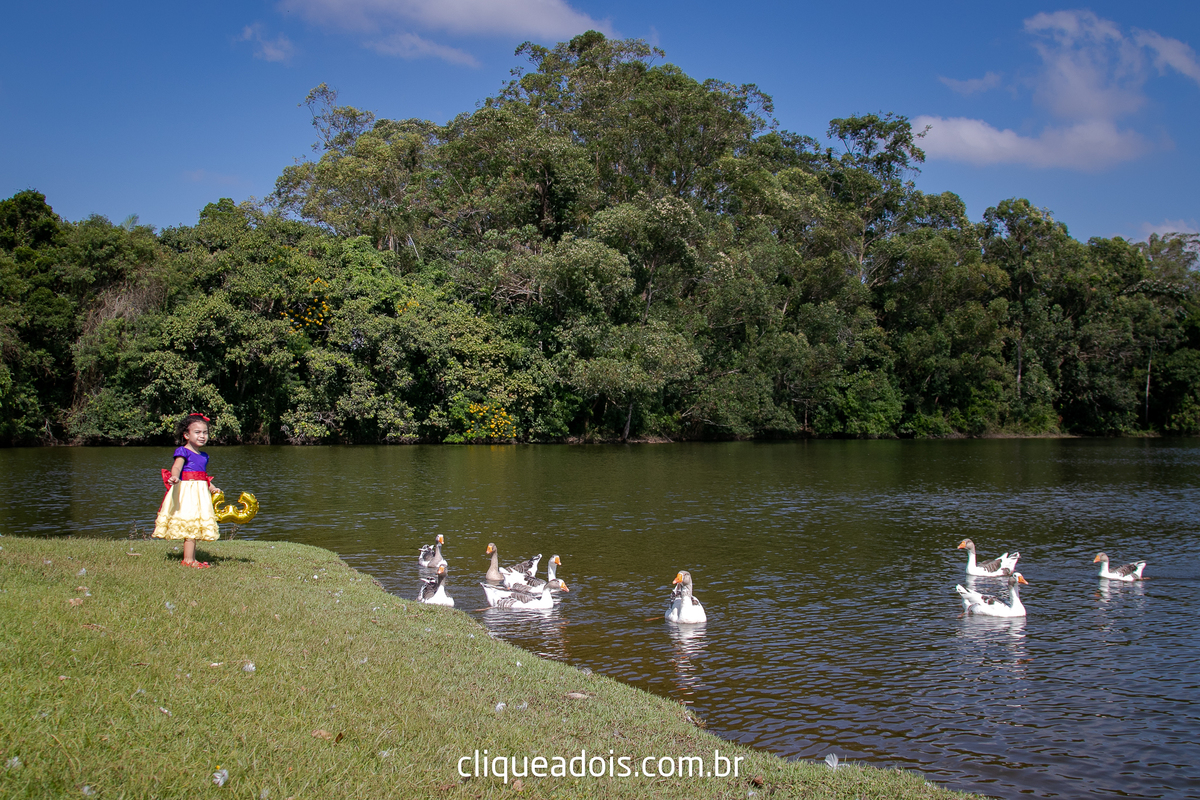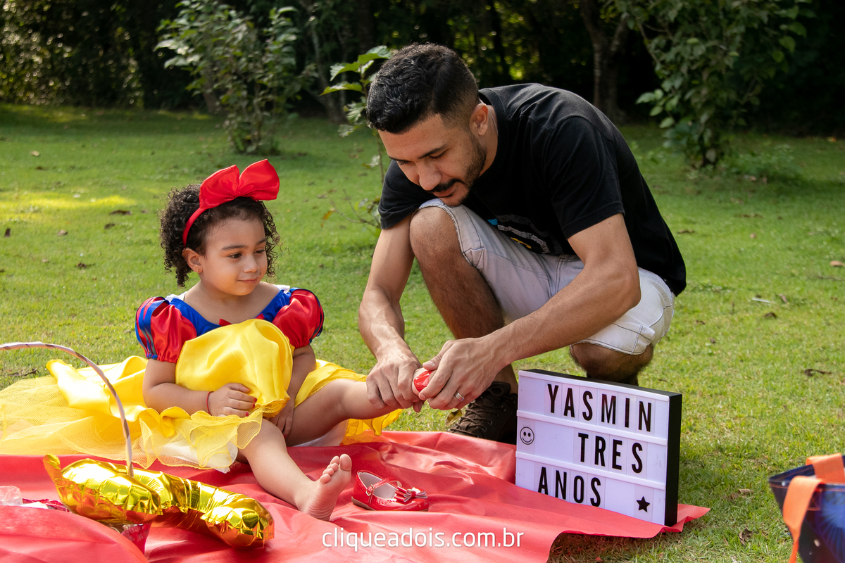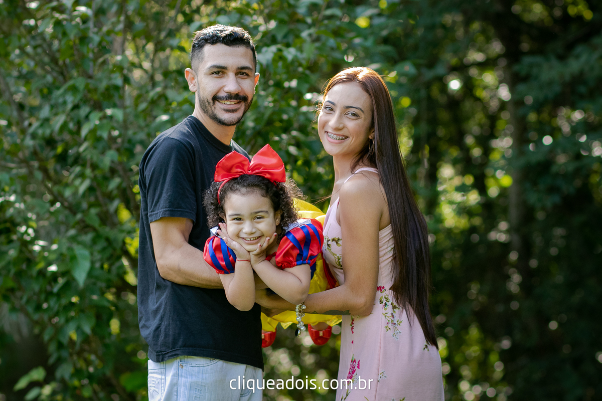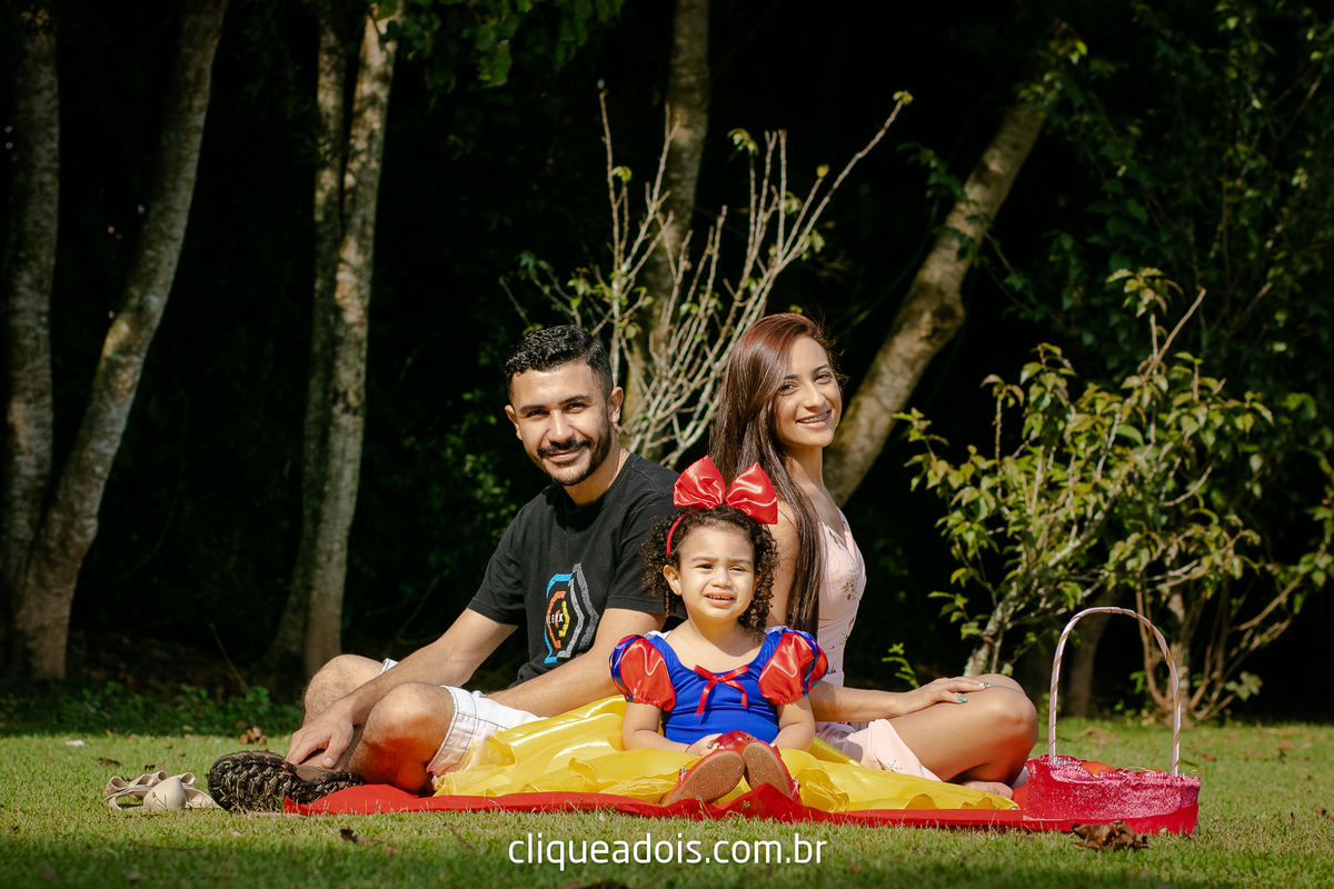 Um belo dia ela pediu a mamãe e o papai para passear no parque e nós fomos lá fazer lindas fotos do ensaio infantil da Branca de Neve.
