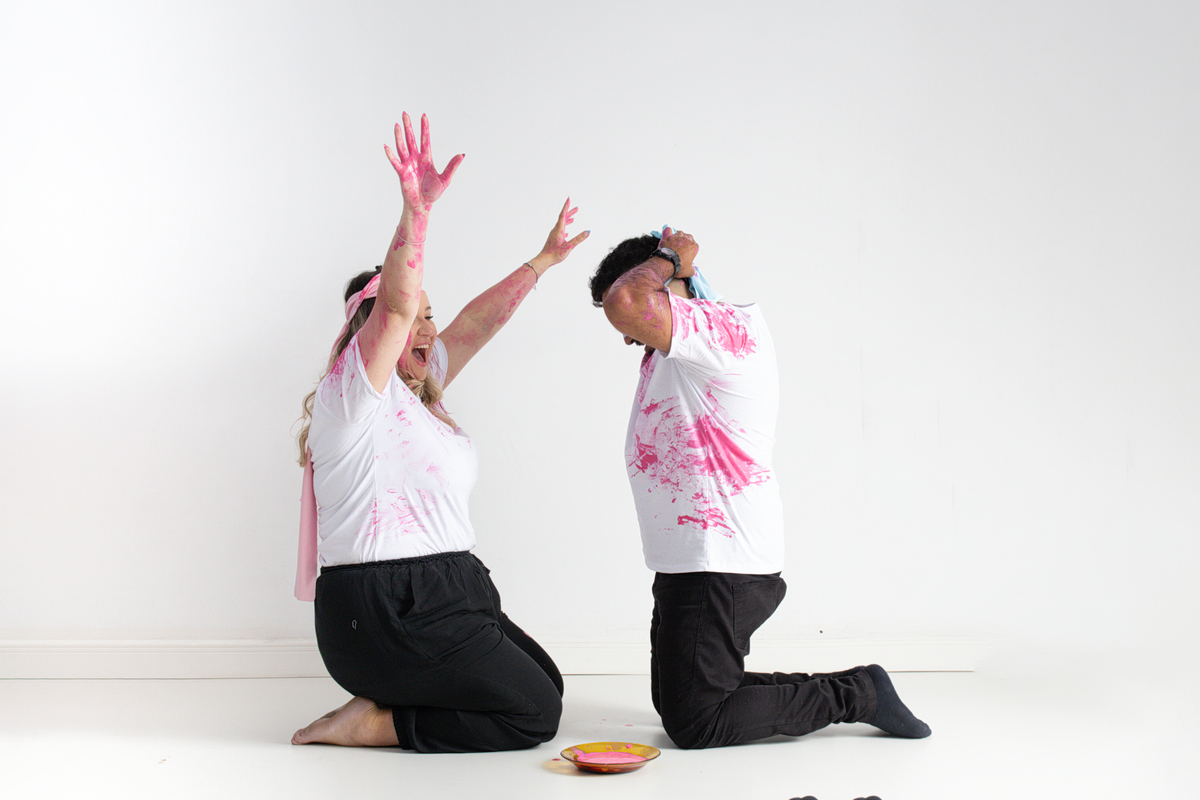 Achei muito legal a ideia, e apesar de ela ainda estar com a barriga pequena, as fotos ficaram lindas. Foi usado muita tinta e efeitos colorida na hora da revelação.